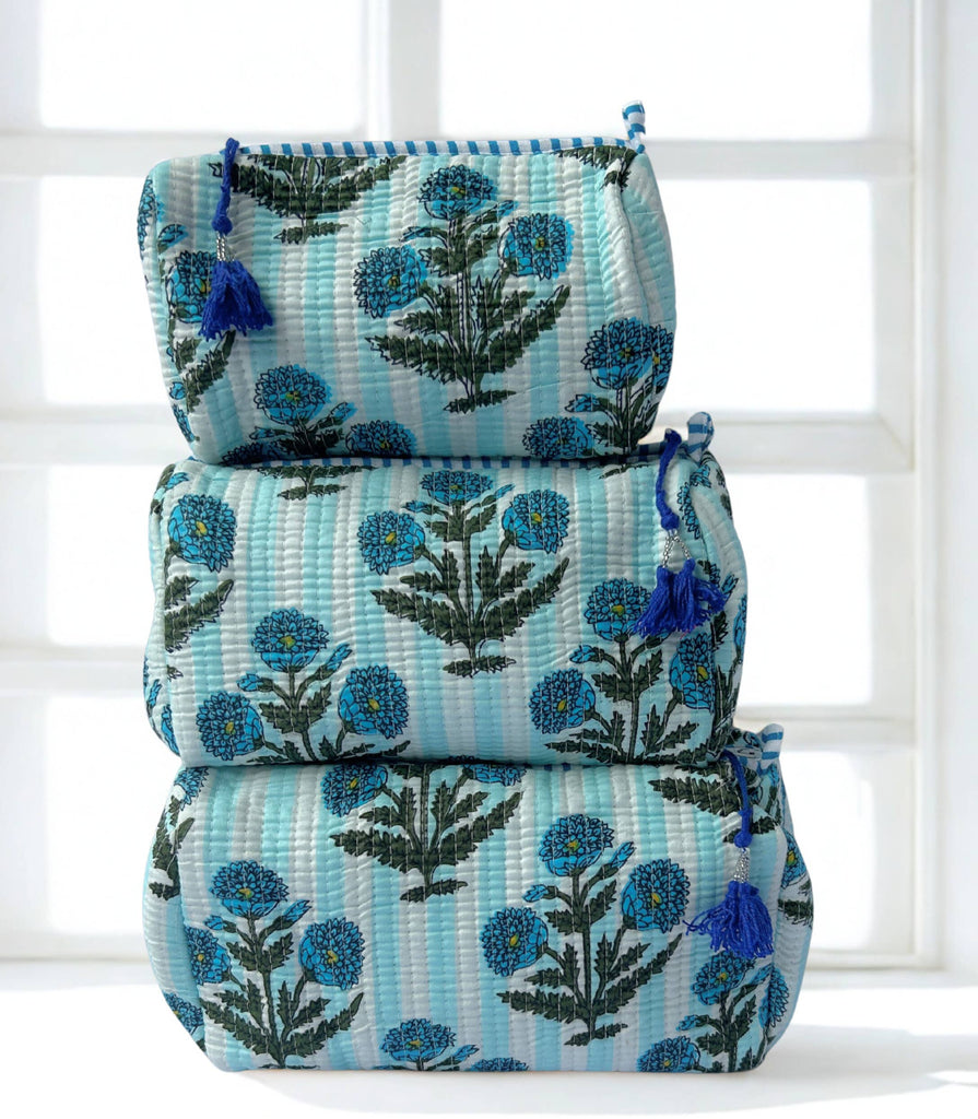 These multi-purpose toiletry bags can be used as cosmetic or vanity bags and are the perfect gifts for any occasion. They come in a set of three which are ideal for organizing travel items including~ makeup, accessories, art supplies, electronics and much more! Fabric ~ 100% cotton with quilted padding and protective vinyl lining.