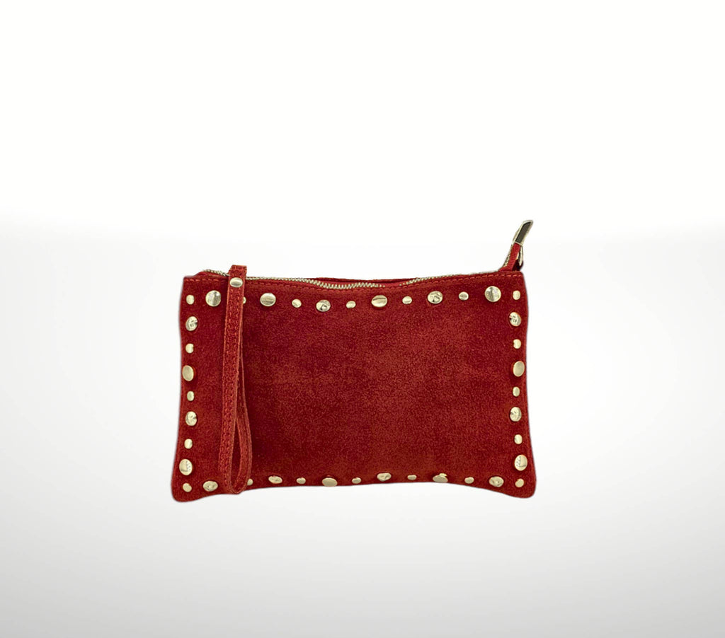 This rectangular crossbody bag with decorative studs has been created for those seeking an elegant, practical, and stylish accessory. Its compact and versatile design makes it an essential piece for those who value details, as it combines the softness of suede with a carefully crafted artisanal finish. The small but functional format makes it ideal for carrying essentials with style, perfect for both everyday use and special occasions.