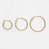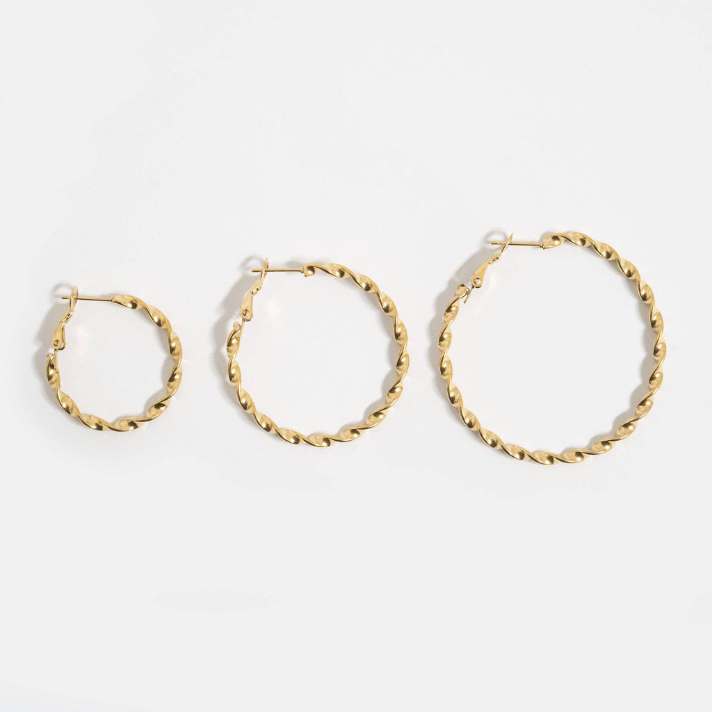 A new must have for your earring collection! A modern twist on a timeless classic. These twisted hoop earrings feature a sleek, sculptural design with a subtle twist detail that catches the light from every angle. Crafted from durable stainless steel and finished in rich 18K gold PVD, they offer lasting shine and everyday elegance. Lightweight and versatile—perfect for elevating any look, day or night. • Trendy twisted design sparkles with the light! • Lightweight & perfect for all day wear • Waterproof, non-tarnish, hypoallergenic