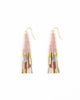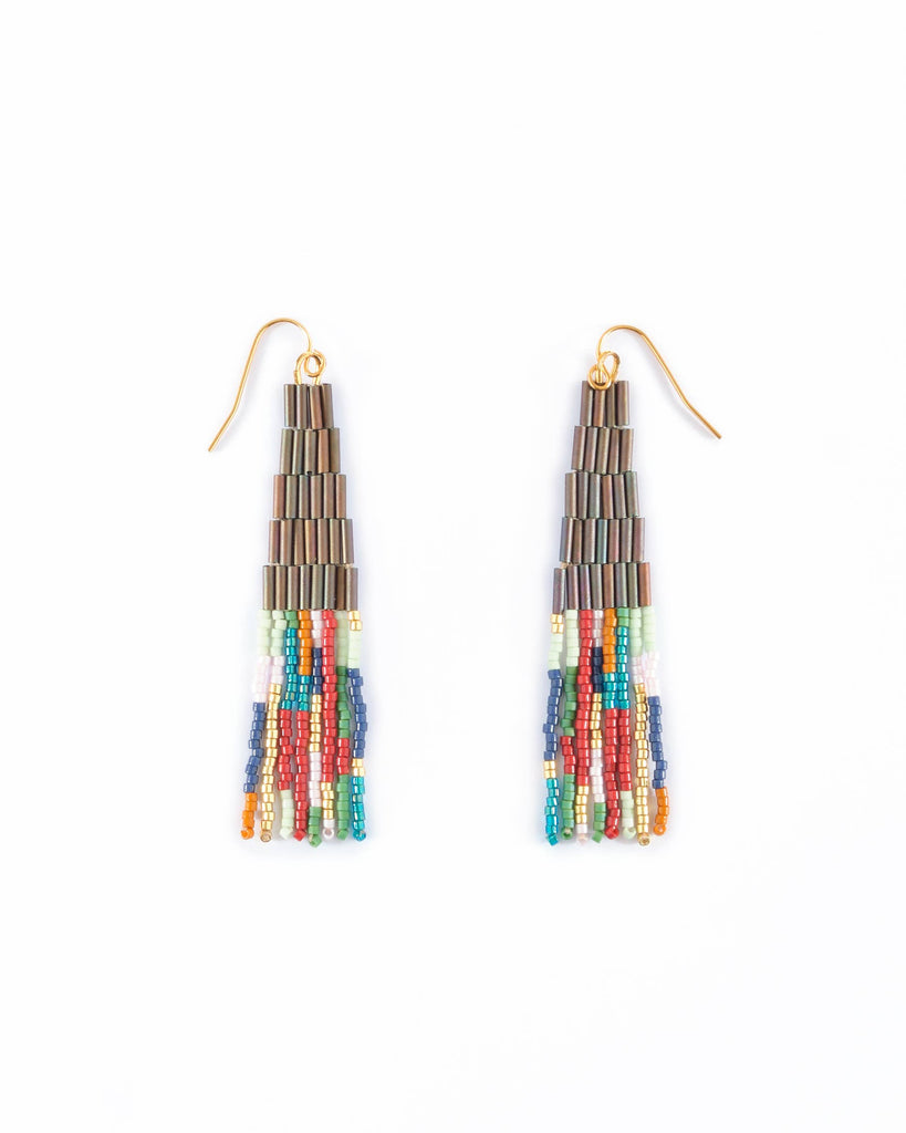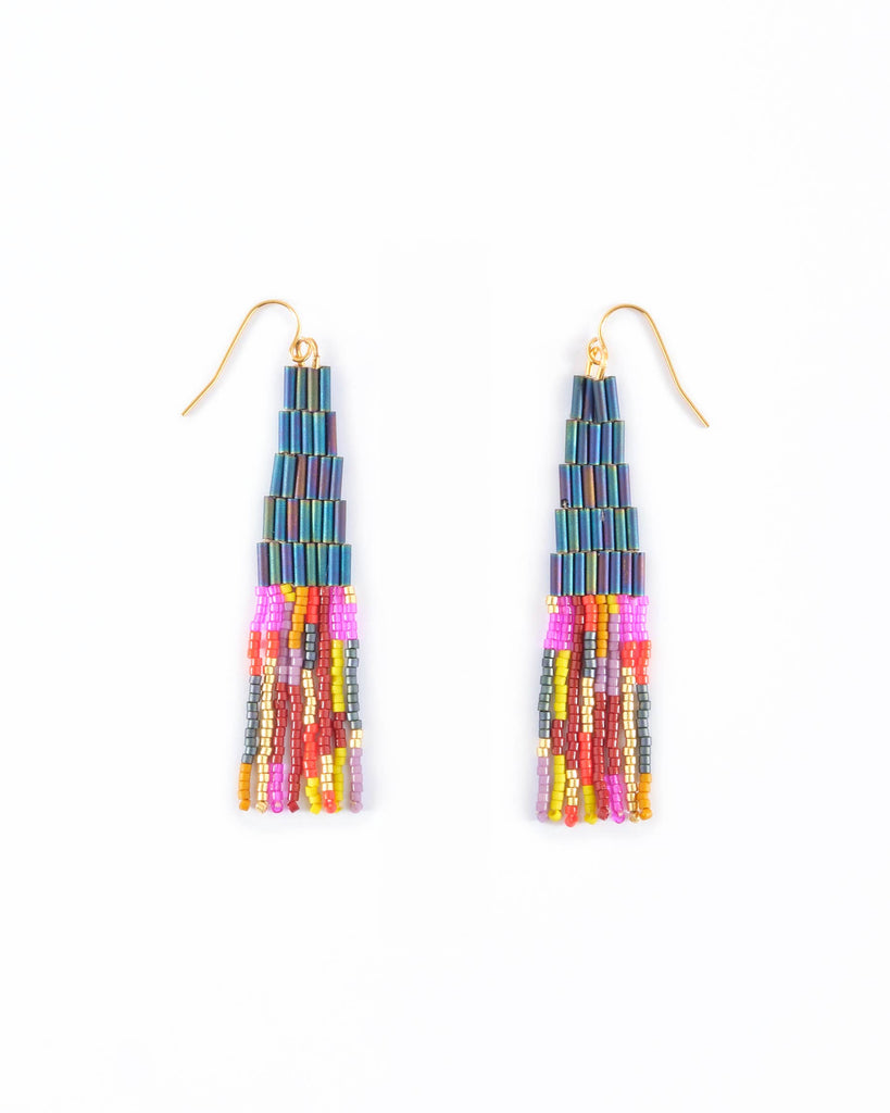 Lightweight, colorful, and unique, these handwoven Japanese Miyuki glass beaded earrings combine tubular beads with classic smaller beads for contrast. The hand strung fringe is made up of beautiful bead colors including gold for a touch of shimmer. This smaller earring size is perfect to use as an everyday accessory, while still making a statement with bold color combinations.