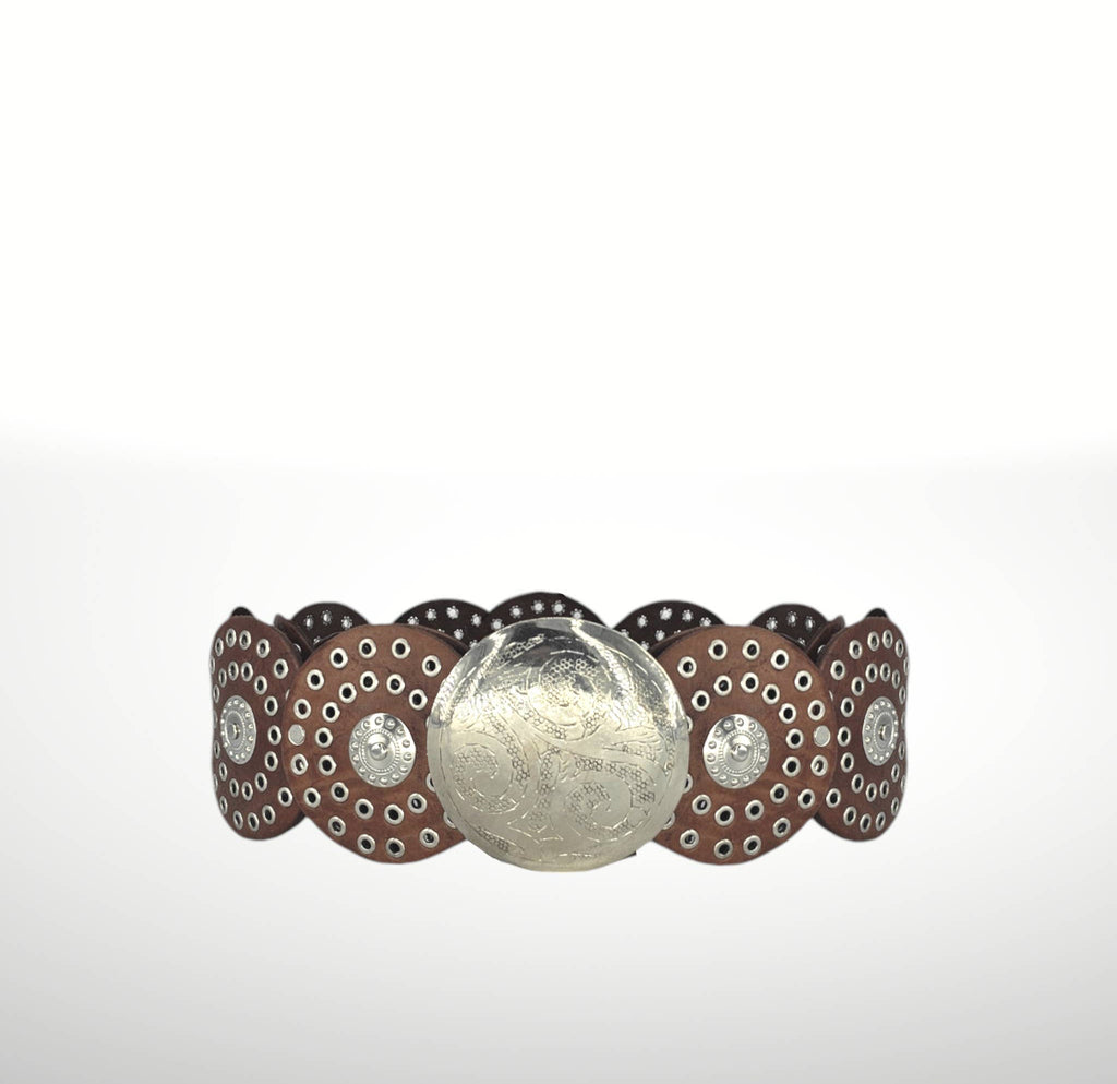 Additional details: Riveted circular embellishments that provide a striking and original design. Buckle type: Metal with secure and adjustable closure. Size: Width of 9 cm, adjustable length between 110 cm and 120 cm.