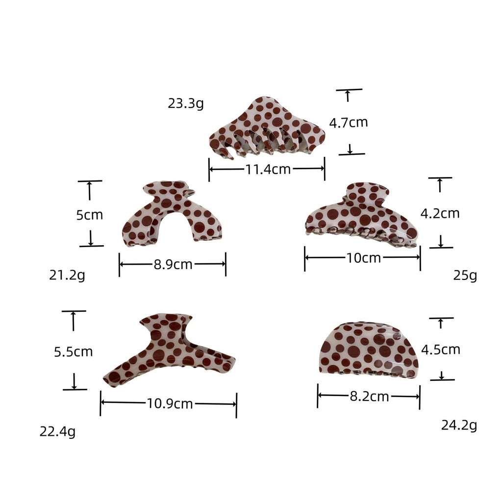 Feature: * Cute, Sweet * Polka Dots * Color Block * Multi-Shape To Choose * Lightweight * Strong Grip * Simple, Versatile, Delicate * Daily Fitting * Gift Weigh: * 10-30g Material: * Acrylic Package: * Package include 1 hair claw. Note: *Avoid Excessive Force: When using the hair clip, avoid pulling or twisting it too tightly to prevent any breakage or damage to the acetate material. *Keep Dry: While this hair clip is designed for everyday use, avoid exposing it to excessive moisture. Water can affect the rhinestones and weaken the adhesive. *Handle with Care: Avoid dropping the clip or subjecting it to impact, as it may cause the rhinestones to loosen or the acetate to crack.