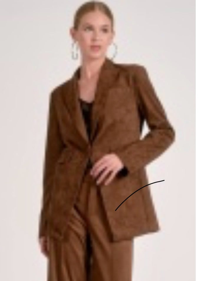 Get ready to take your fall style to the next level with our Suede Blazer! This classic jacket is perfect for adding a touch of sophistication to any outfit. Made with soft suede, it's sure to keep you warm and stylish all season long. Upgrade your wardrobe with this must-have piece!