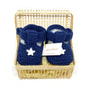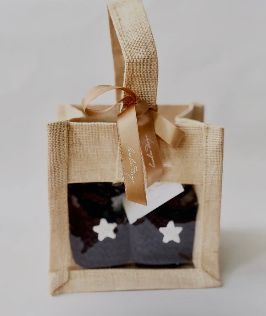 Modern knit booties. Beautifully packaged for gift-giving. 0-6 months. 100% Cotton. Shell button. Handwash. Natural Packaging.