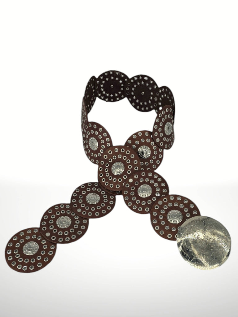 Additional details: Riveted circular embellishments that provide a striking and original design. Buckle type: Metal with secure and adjustable closure. Size: Width of 9 cm, adjustable length between 110 cm and 120 cm.